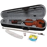 The instrument itself has a spruce top with maple back and sides. Other parts are of dyed hardwood with a metal alloy, four tuner tailpiece. The violin has been meticulously set-up and packed in a protective cloth. The bridge is in place, the strings are loosened for shipping. The bow is made of wood, and rosin for the bow is included. The sturdy carrying case has light foam padding as well as a handle and shoulder strap.