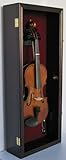 Display case handcrafted from solid wood. With hanger to hold a violin. Red color felt interior background for a lovely display. Built in hanger for the violin. Hinged lockable UV Protection Plexi-glass door to prevent dust and protect. Metal brackets on the back of the display case made it easy for hanging. Comes with built-in Lock.
